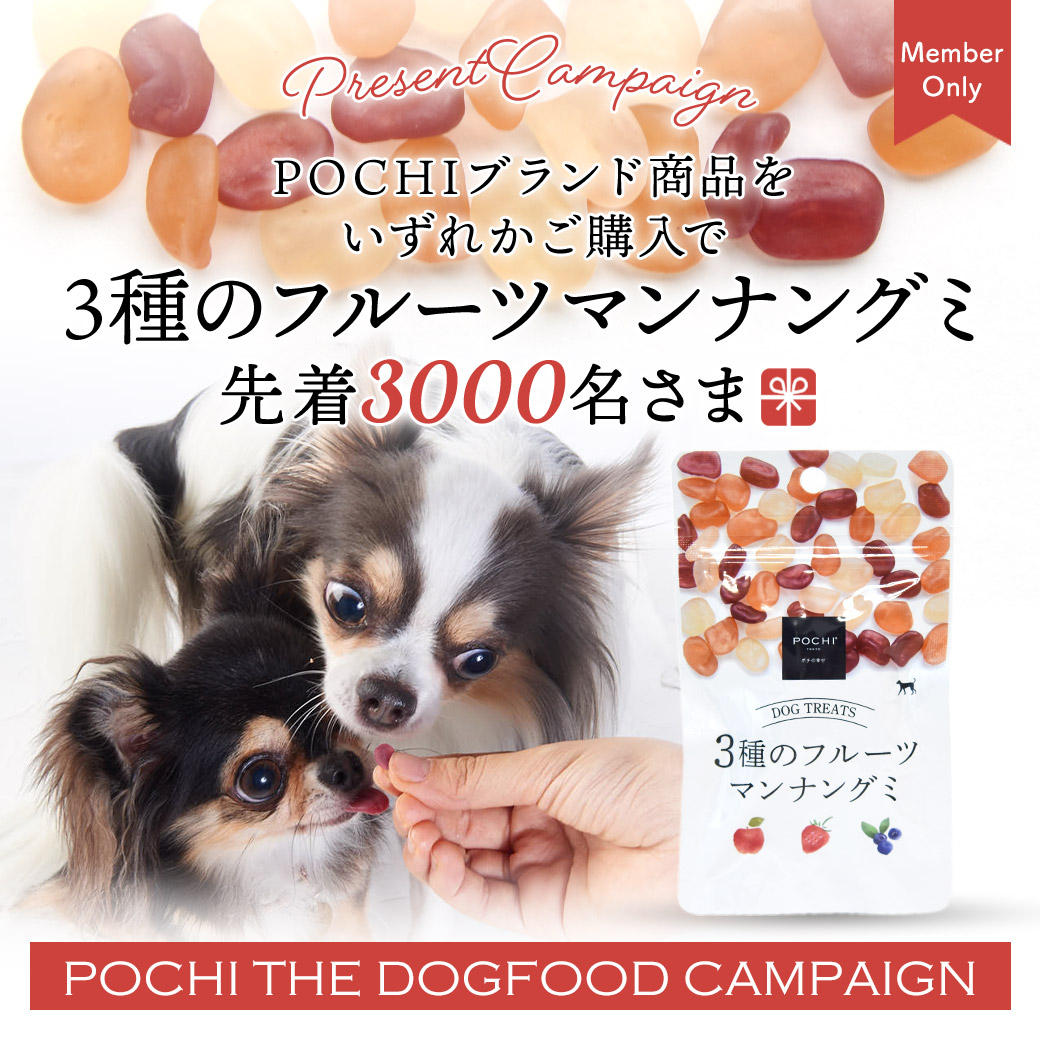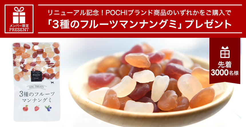 【終了】《POCHI ザ・ドッグフード》リニューアル記念!対象の先着3000名様「3種のフルーツマンナングミ」プレゼント!