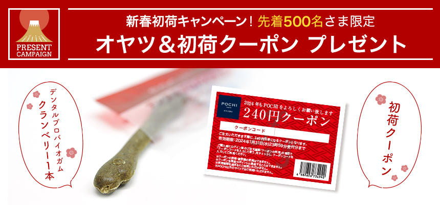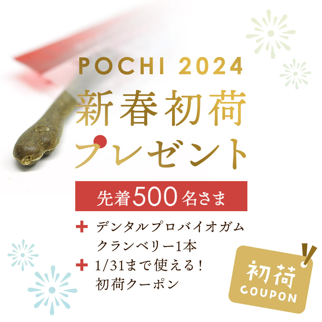■ プレゼント品:「POCHI 初荷プレゼント 2024(初荷クーポン&デンタルプロバイオガム クランベリー 1本)」を各おひとつ