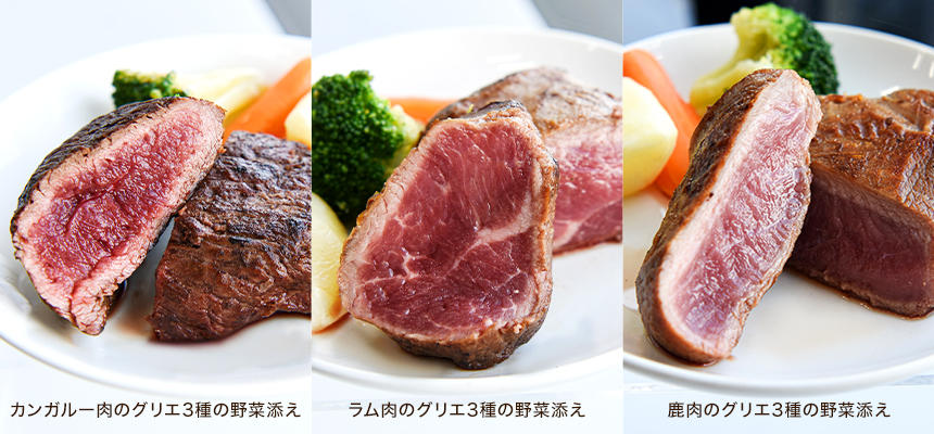 今回はどれも高タンパク・低脂肪肉と言われるカンガルー肉・ラム肉・鹿肉の3種類のお肉をご用意しました。