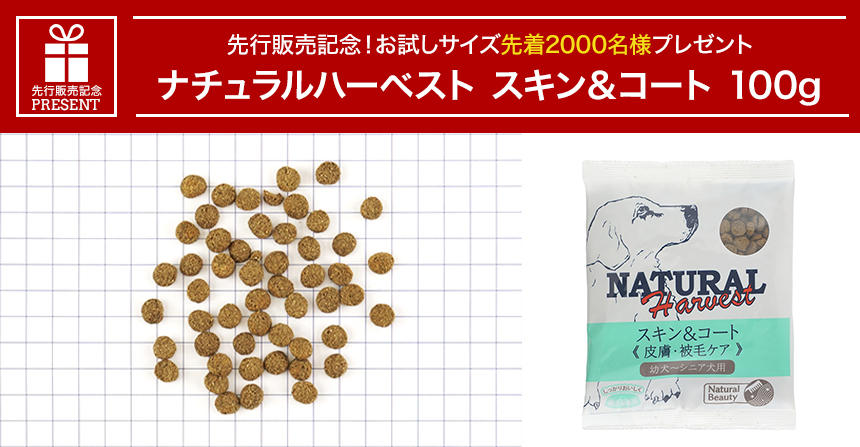 ※先に「ナチュラルハーベスト スキン&コート100g」の方のプレゼントが終了します。ご注文時の最終確認画面でプレゼント品明細が表示されているかご確認ください。また表示されていない場合は先着数に達していますのでご了承ください。