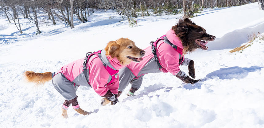 雪シーズン用に、裏ボア仕様で保温性が高くピタッとしたタイプのウェアもありますが、レトリーバーたちは冬でも川で泳いだりするので寒さは強いですし、レインコートタイプで十分かなと。首までつながっている洋服ではなく、別途スヌードを活用するのも良いかと思います」(チェリー&シュガーママ)