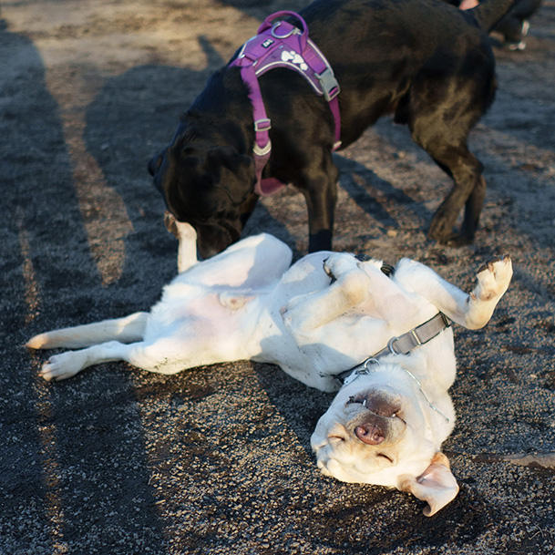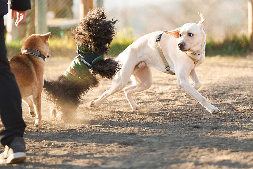 一方で、ドッグランデビュー間もない新参者としては、常連さんで占められるドッグランに入りにくさを感じたのも正直なところだ、ルカ本人は、初対面の犬にも警戒心をほとんど与えない温和な性格なため、誰とでも遊べる方だ。一方で、新参者に対してマウントを取ってやろうという犬も少なからずいて、マウンティングなどのちょっかいのターゲットにされがちだ。ルカはしつこい子を一喝して遠ざけるような強さには欠ける性格なので、体当たりされたり、のしかかられて転ばされることが多い。そして、最後には「もうやめて〜」と降参のポーズを取るのがいつものパターンだ。飼い主としてはそうした犬社会の上下関係を見ているのも興味深いのだが、いつかケガをさせられてしまうのではとひやひやする。でも、ルカはルカで他の子のオモチャを奪ってドヤ顔で走り去ったりするので、お互いさまなのだが・・・。