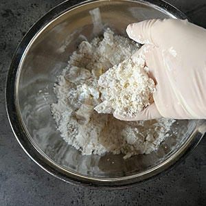 2.1に無塩バターを入れ、手ですり混ぜながらポロポロの状態にする。