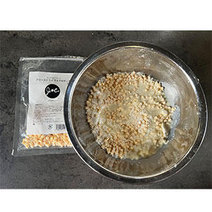 3.2にJ&C プレミアムトリーツ フリーズドライ マイクロチーズをいれ、混ぜ合わせたら豆乳もいれ、切るようにヘラを使って混ぜ合わせる。