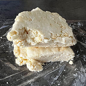 5.4を半分に切っては重ねてを4回ほど繰り返し、厚さを2cm位にして一口サイズの型で抜いていく。