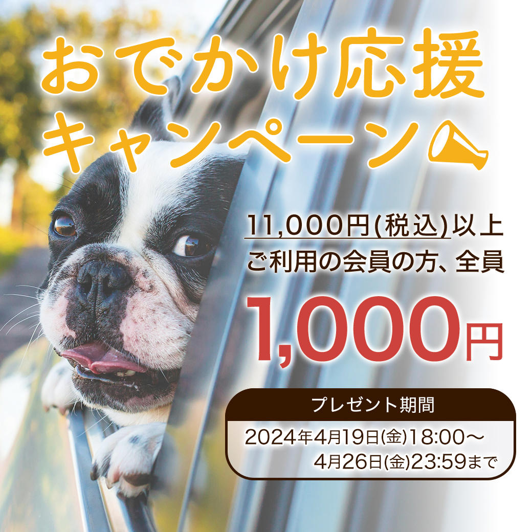 ゴールデンウィークの休日に、犬たちと一緒に思いっきりたのしんでいただくために、おでかけ応援キャンペーンとして1000円クーポンをプレゼント。