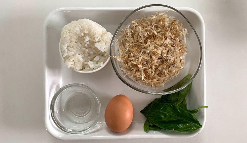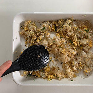 3.粗熱を取った白飯にJ&C イワシ花削り 20g、1の炒り卵、