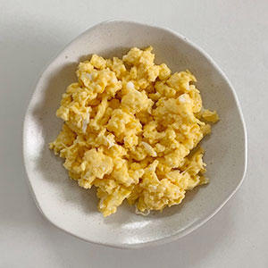 1.細かい炒り卵を作る。卵をよく溶いておく。小鍋に油を薄くしき、熱したら卵を一気にいれる。箸を6本ほど使って手早くかき混ぜながら火入れする。卵がホロホロっと乾き始めても手は休めず、焦がさないように混ぜ続けます。完全に火が通ってポロポロの状態になればOK。