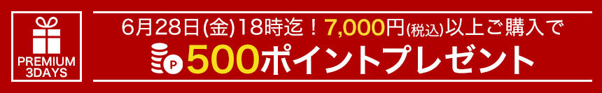 6月28日(金)までに7000円(税込)以上ご購入いただいた方全員に500ポイントプレゼント!