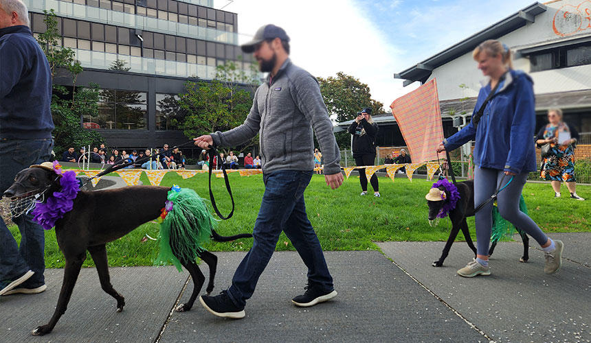 グレイハウンドたちはハワイアンの衣装に身を包んで行進。