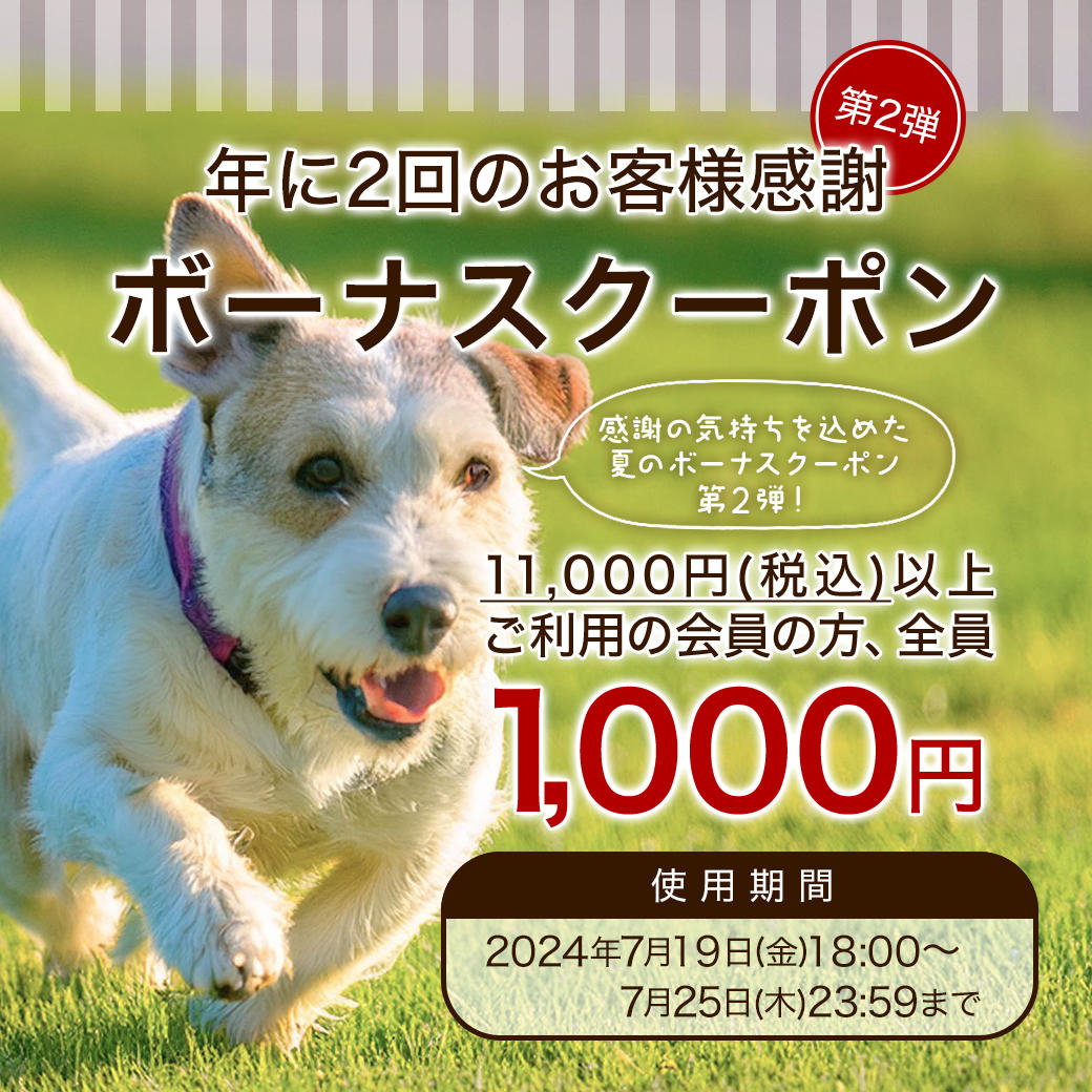 【終了】7/25(木)23:59まで【メンバー限定】年に2回のお客様感謝《夏のボーナスクーポン第2弾》1000円