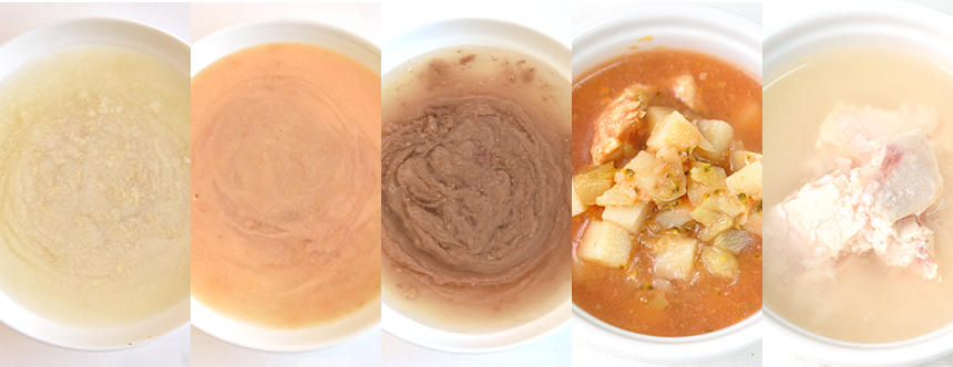 鶏肉・サーモン・馬肉のとろみがついて、ドライフードにもからみやすいスープ3種に、 夏の栄養と嗜好性ばつぐんの鶏肉と野菜のトマトスープとチキンのスープ煮、計5種のスープセットです。