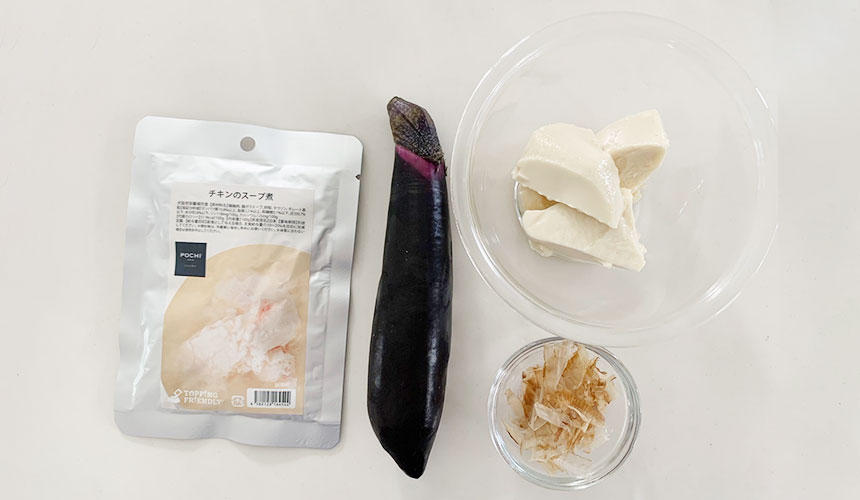 今回は旬のナスとPOCHI チキンのスープ煮を使って、シニアでも食べやすくアレンジした、ナスと豆腐のとろとろトッピングのご紹介です。