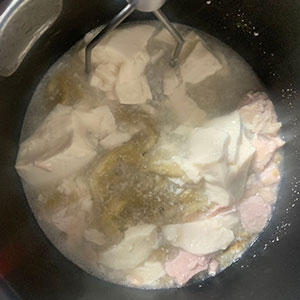 5.鍋にPOCHI チキンのスープ煮、ナス、豆腐を入れ、さっと煮たら、マッシャーで潰す。