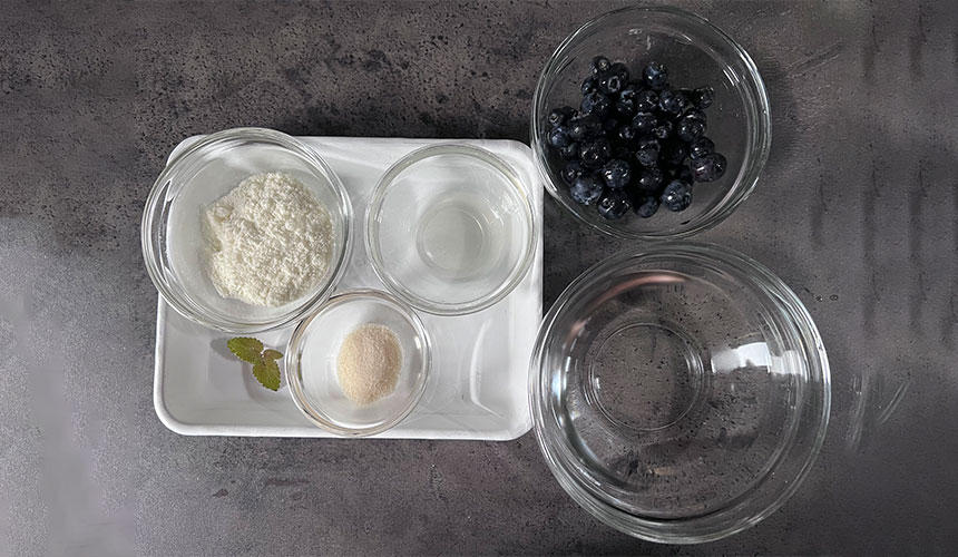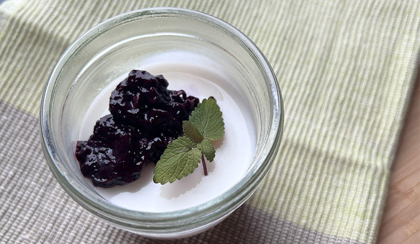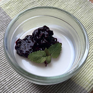 ミルクプリンの材料はゴートミルクとゼラチンだけ。優しい味わいでそのままでもおいしくいただけますが、今回は旬のブルーベリーを使ったソースをトッピングしてみました。