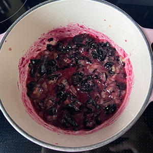 1.ブルーベリーソースを作る。鍋にブルーベリー、レモン果汁をいれ、弱火にかける。ブルーベリーを潰しながら煮て、1/3程度の量になったら火を止めて冷ます。