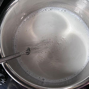 2.鍋に水を入れ、火にかけ50℃~60℃くらいまで温めゴートミルクを入れる。