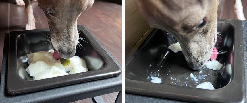 ブルーベリーソースも気に入ってくれた様子。うちの子は別々に味わっていました。水分補給にもなって夏にぴったりのデザートかも!材料も少なくて簡単にできるからまた作ってあげるね。