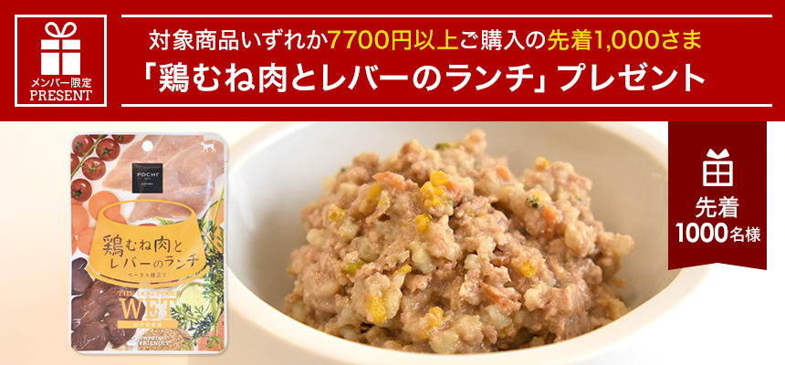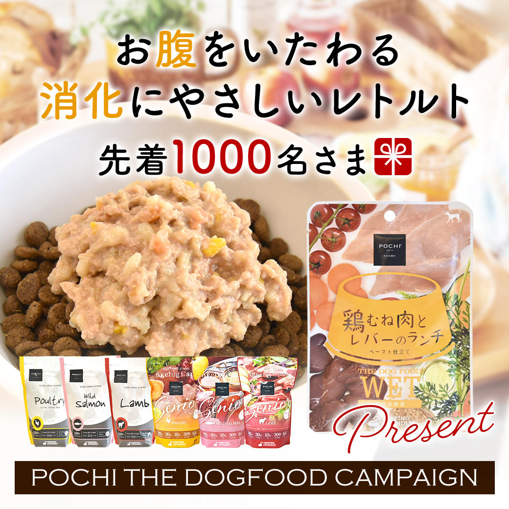 今回お腹をいたわる消化にやさしいレトルトとして、「POCHI ザ・ドッグフード ウェット 鶏むね肉とレバーのランチ」を先着プレゼントとしてご用意。