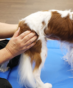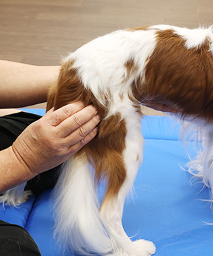 筋力が加齢とともに衰えてくる老犬や、後肢の関節や膝などにトラブルを抱えている犬が、しっかりと、そしてスムーズに後脚を動かせるよう、お尻の筋肉をサークルでほぐしてあげましょう。