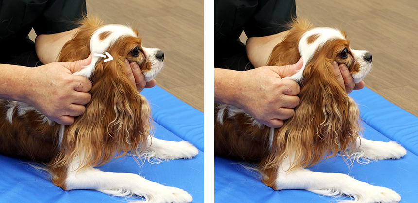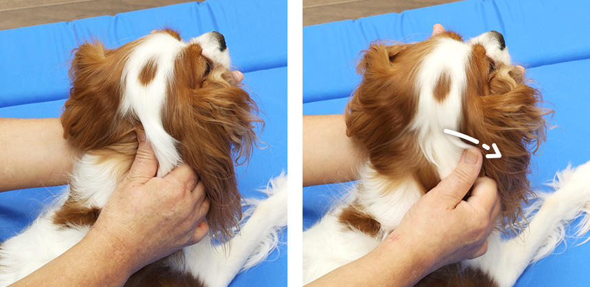 揉はもむ、捏はこねるという意味のとおり、飼い主さんの指の腹でしっかりマッサージ。犬の皮膚を指の腹で押し上げたら、外側に開くようにしてもみます。