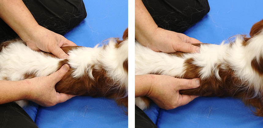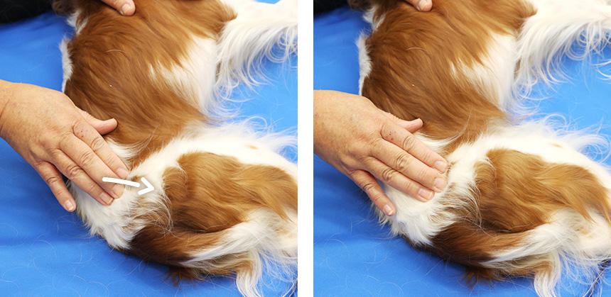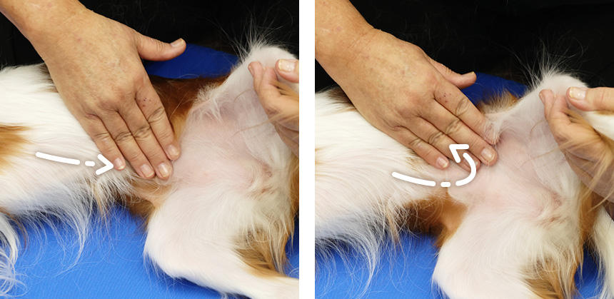 指の第1関節より下の部分を使い、腸の上部から下部に向かってさすってください。下部までエフラージをしたら、後肢の付け根に向かってサークルでほぐします。