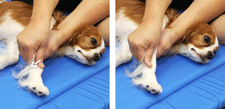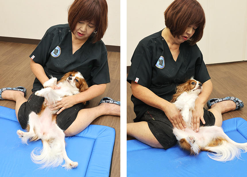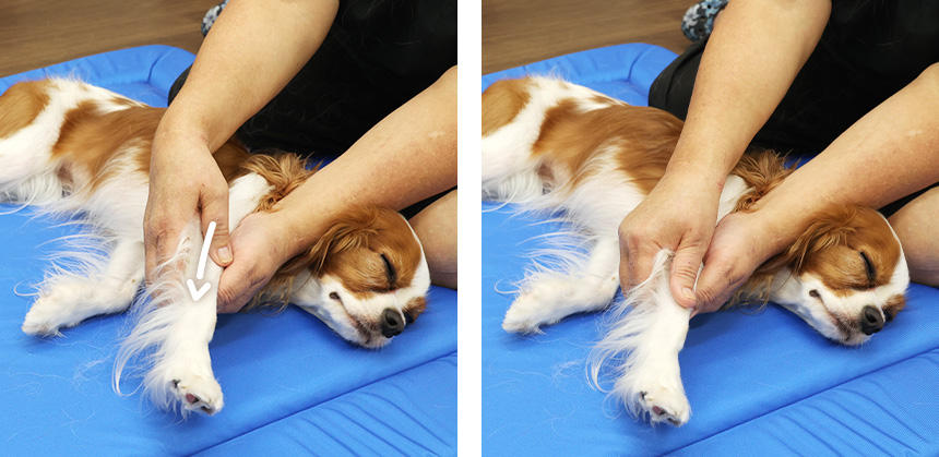 犬が寝ている姿勢で行う場合は、片側ずつ行います。