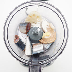 3.フードプロセッサーに1のサンマ、豆腐、れんこん、エリンギを入れ、おろししょうが、片栗粉を加え粘りが出るまで混ぜる。