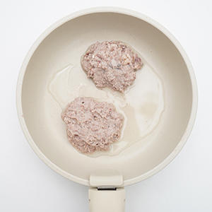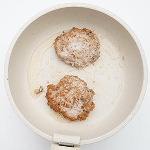 4.2等分にして小判型に成形したら、フライパンに油をしき、中火で焼いていく。両面に焼き目がついたら弱火にして蓋をして3分ほど加熱する。