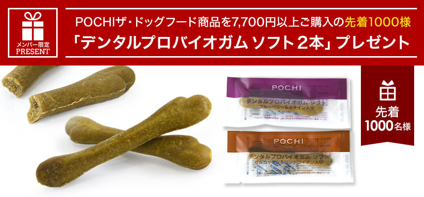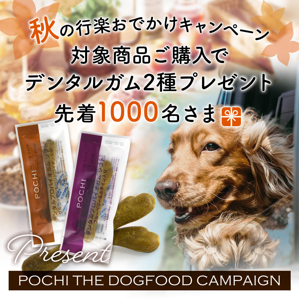今回秋の行楽おでかけキャンペーンとして、持ち運びに便利でシニア犬や小型犬にも食べやすい「POCHIデンタルプロバイオガムソフト2本」を先着プレゼントとしてご用意。
