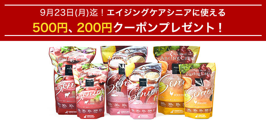 500円クーポンはエイジングケアシニア各3kg (6,590円)をご購入時に、 200円クーポンはエイジングケアシニア各1kg (2,420円)をご購入時にご利用いただけます。