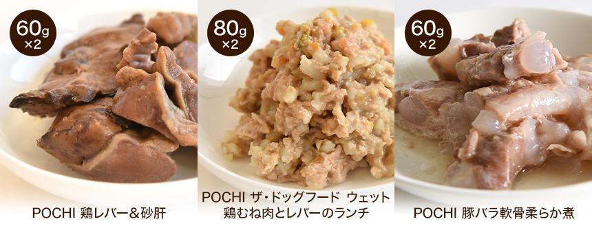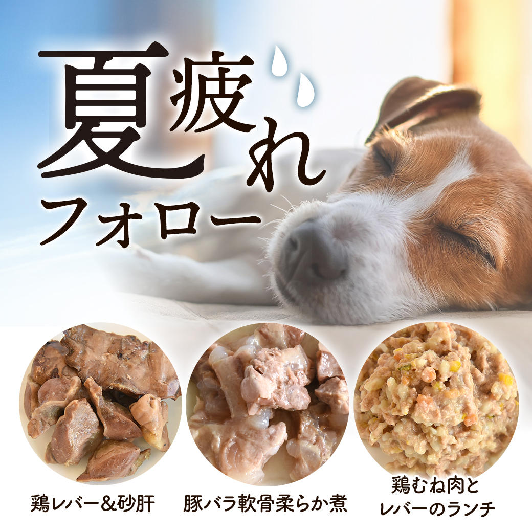 セット内容は、鉄分やビタミン豊富な鶏レバーと砂肝をレトルト加工した「鶏レバー&砂肝」、 コラーゲンやコンドロイチンを含むのでシニア犬にもオススメの「豚バラ軟骨柔らか煮」、 鶏のむね肉と栄養豊富で大好物な犬が多いレバーをベースにした総合栄養食ウェット「鶏むね肉とレバーのランチ」の3種類。