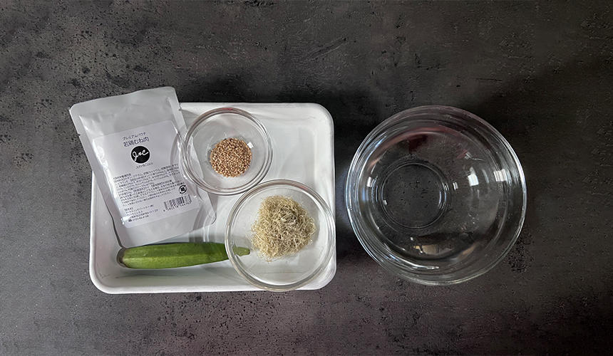 2.器にJ&C プレミアムパウチ 若鶏むね肉、1のオクラ、とろろ昆布をいれる。