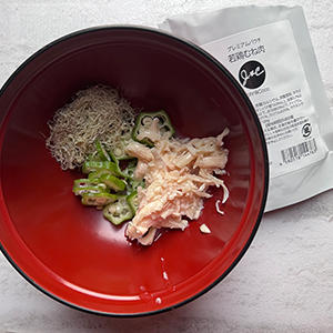 お腹の弱いうちの子、この夏は暑くてしんどかったようで、ごはんを食べなかったり、お水も少ししか飲まなかったりととても心配でした。大好きな鶏肉のはいったすまし汁で胃腸を整えましょう。オクラも薄く切ったので食べやすく、とろろ昆布のうま味で汁も気に入っていました。水分補給にもおすすめのごはんです。
