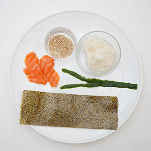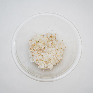 1.ボウルにごはん、白ごまをいれ混ぜ合わせる。サーモンは薄切りにする。(1切れ5g程度)