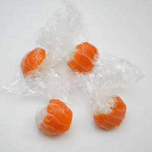 2.1のごはんを四等分にし、団子状にし(1つあたり15g程度)ラップを広げてサーモンをのせ、ごはんをのせ、ラップの端を集めてぎゅっと絞り丸くなるよう形を整える。