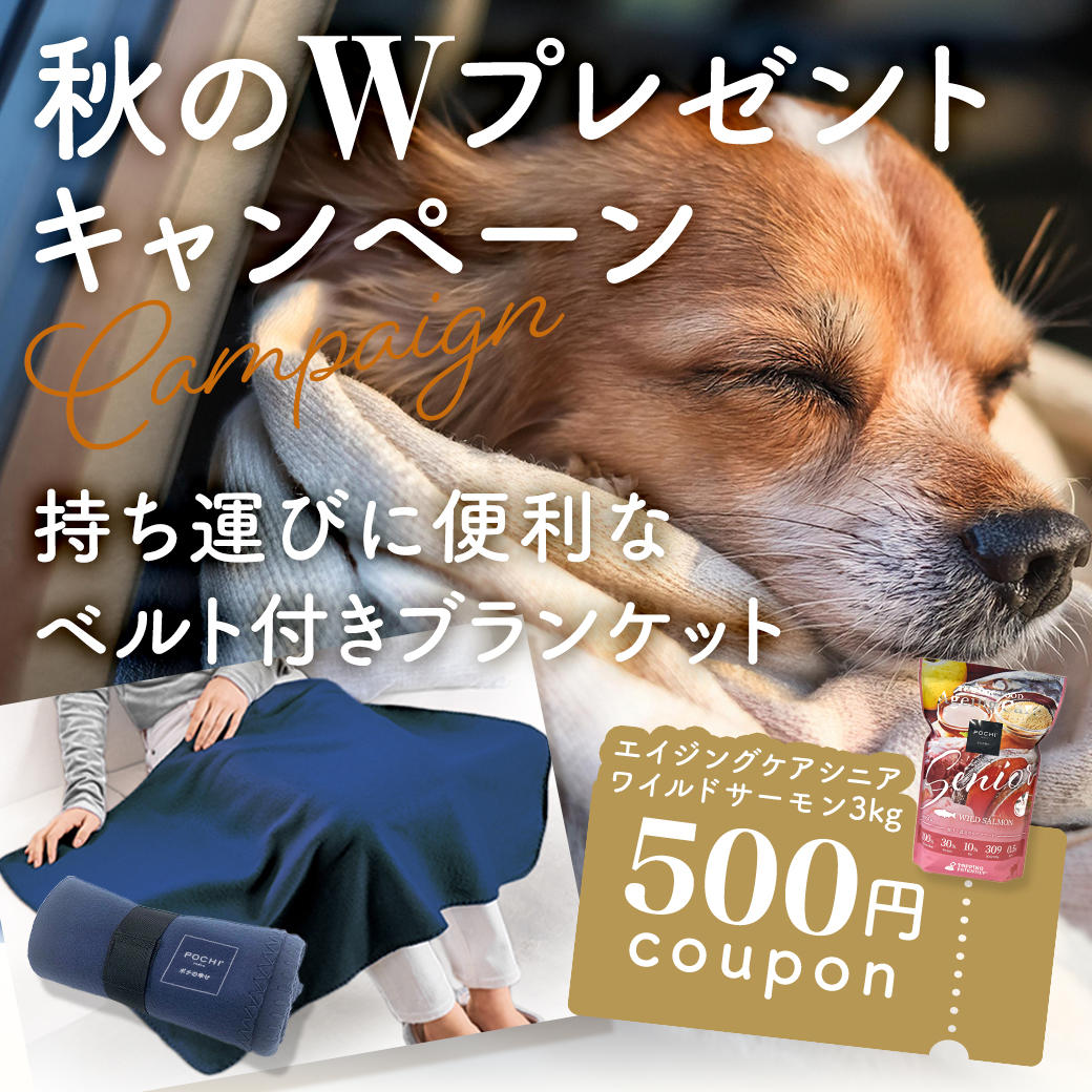 今回秋のWプレゼントキャンペーンとして、POCHI ザ・ドッグフードいずれかを7,700円(税込)以上ご購入の方を対象に「POCHIオリジナルブランケット」プレゼント&エイジングケアシニアワイルドサーモン3kgに使える「500円クーポン」プレゼントします。