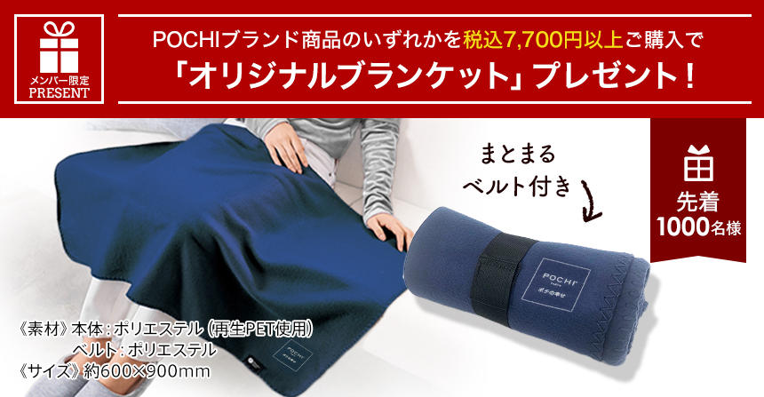 □プレゼント品:1回のご注文毎に、「POCHI オリジナルブランケット ベルト付き」おひとつ