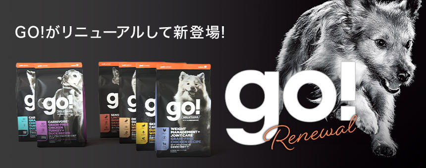 「go!」は犬たちの悩みを解決するソリューションフードとして、引き締まった体型をサポートする「カーニボアシリーズ」に成犬用とシニア用の2種、「目的別ケアシリーズ」にはアレルギー、体重管理+関節、皮膚+被毛、消化+腸の4種類があります。