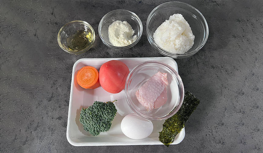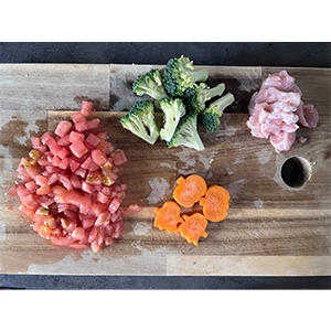 1.鶏肉、トマトは小さめにカットしておく。(トマトの水分はごはんの色付けになるので捨てずにとっておく)人参、ブロッコリーは食べやすい大きさに切っておく。(型抜きしてもOK)