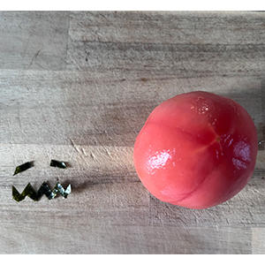 下準備:トマトは皮をむいておく。海苔をお化けの目と口の形に切っておく。