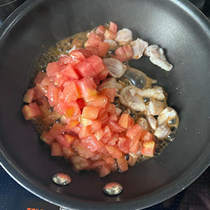 3.フライパンに鶏肉をいれ、火が通ったらトマトを入れ炒める。