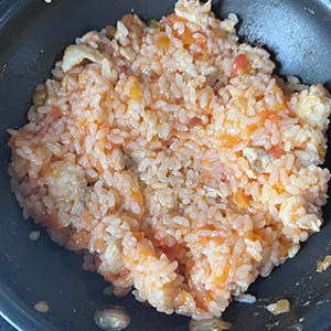 4.トマトの水分が少なくなってきたら3にごはんをいれ色のムラがないように炒めたら、冷ましておく。
