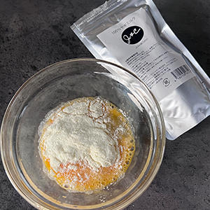 5.ボウルに卵を溶き、ヤギミルク、水10g(分量外)をいれる。