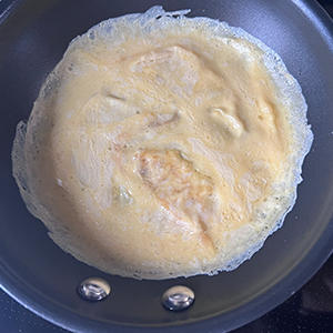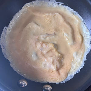 6.フライパンに半量こめ油をいれ、油が温まったら5を半量流しいれる。すぐにフライパンを回しながら全体に卵液が広がるように回し続ける。(ヤギミルクは焦げやすいので、火力は弱めに設定してください)卵液が動かなくなったら火をとめ、蓋をして2分放置する。