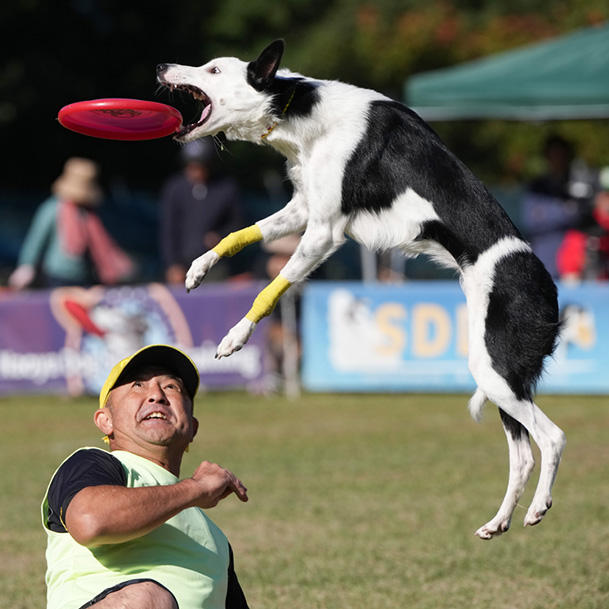 撮影者視点でのディスクドッグの最大の魅力は、躍動する犬たちの美しい姿はもちろんですが、競技を通じて「人と犬の絆」が見られることだと思います。選手と犬の間に強い信頼関係がないと、危険を伴う技や難しいキャッチを成功させることはできません。これは、僕がライフワークとして撮影しているアイメイト(「公益財団法人アイメイト協会」出身の盲導犬)と使用者の関係と同じです。アイメイト歩行でも、お互いの揺るぎない信頼があってはじめて、安全に街を歩くことができます。