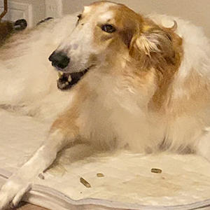 大型犬ボルゾイの方は、初めて見るタイプのガムに初めは警戒をして匂いを嗅ぎ回って調べていましたが、食べ物と気づくと初めは不審ながら噛みつつ、どんどん夢中になっていました。(2分程で完食)