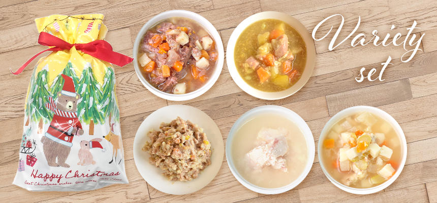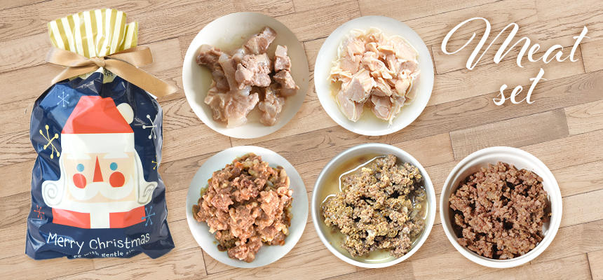 「クリスマスディナーレトルトセット ミート」は鶏肉、豚肉、鹿肉、馬肉、いろんなお肉のレトルトを集めたセット。