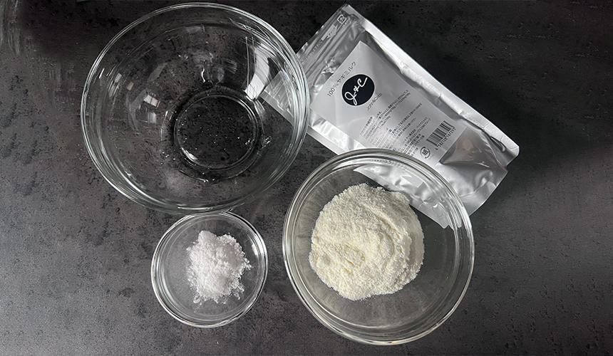 1.水あめをボウルにいれ、電子レンジで500wで30秒加熱し、J&C 100%ヤギミルクをいれ、ゴムヘラで切るように混ぜる。