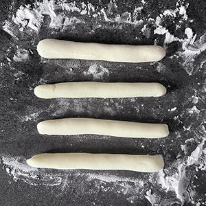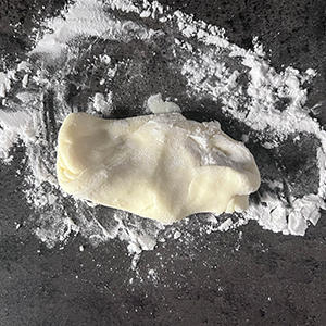 2.ひとかたまりになったら取り出し、米粉をまぶし、手で練り転がす。